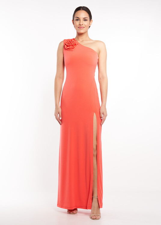 Envy Félvállas egyszínű maxi ruha rózsa dísszel gyűrődésmentes anyagból.