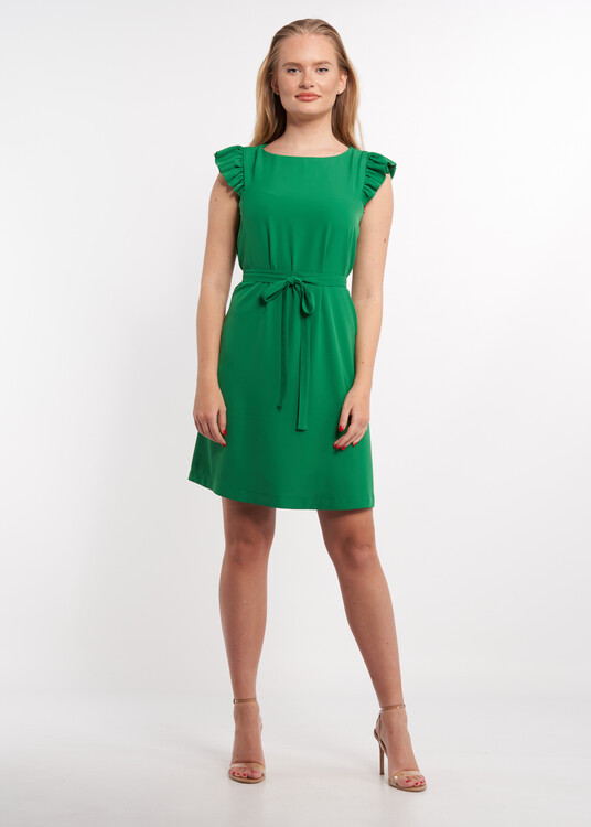 Ujjatlan, fodros vállú, lezser, egyszínű ruha derekán övvel.