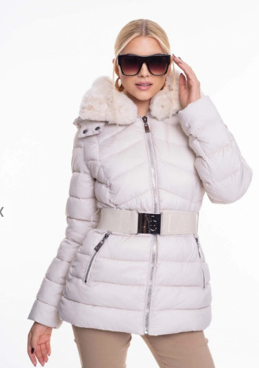 Karcsúsított öves steppelt kabát legombolható igazszőrmével, lecippzárazható kapucnival, ujján fém márkajelzéssel.