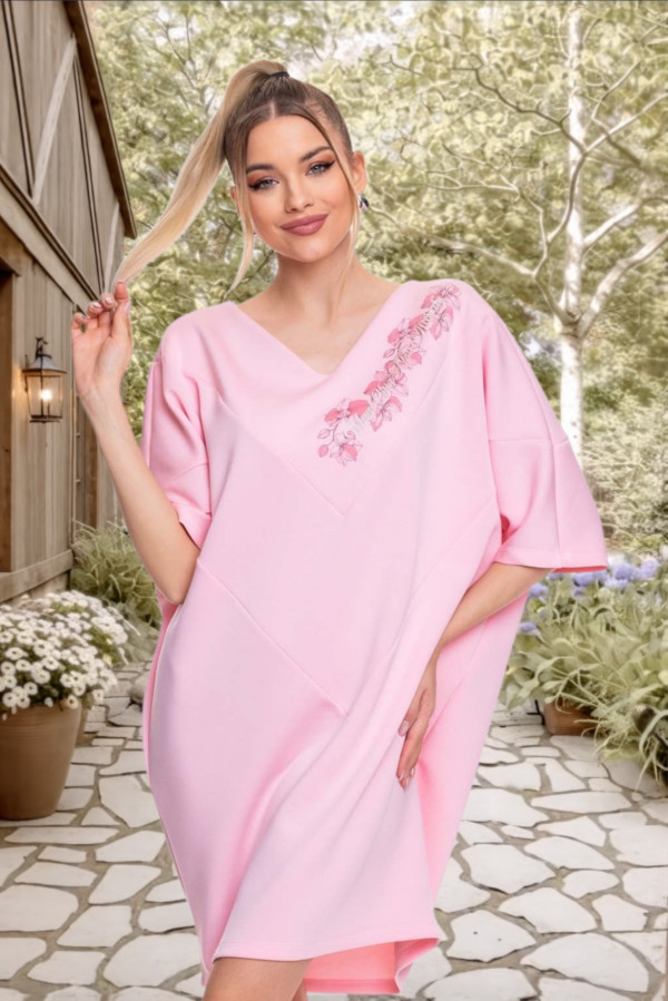 Elasztikus anyagból készült, lezser szabásvonalú ruha, matricanyomott díszítéssel és márkajelzéssel.