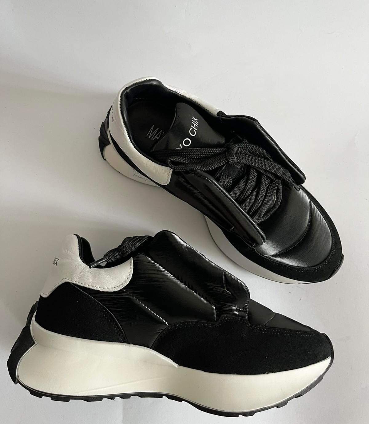 Sportos fazonú, fűzős cipő orkán és velúr hatású anyagú felsőrésszel, filmnyomott márkajelzéssel.