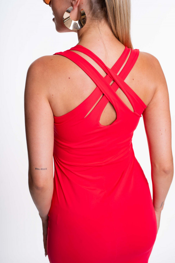 Elasztikus anyagból készült ruha mellrészen bélelővel, keresztpántos megoldással, kis fém márkajelzéssel.