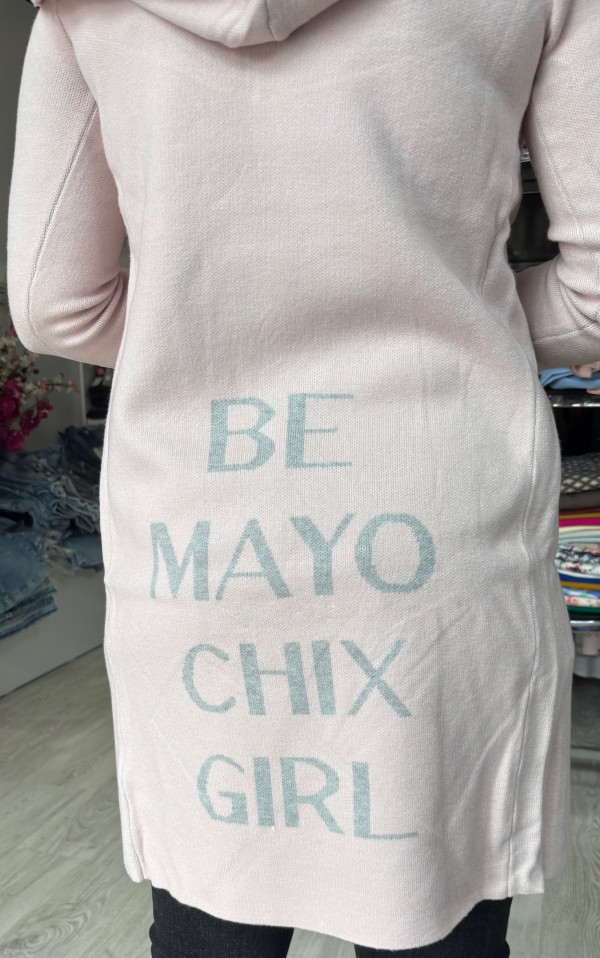 Elasztikus, vékony kötött anyagú nyitott kardigán kapucnival, hátán anyagában kötött márkajelzéssel.