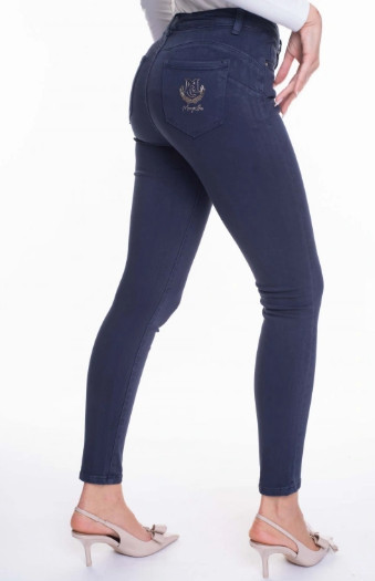 Elasztikus anyagból kérszült szűkszárú nadrág, dombornyomott márkajelzéssel.