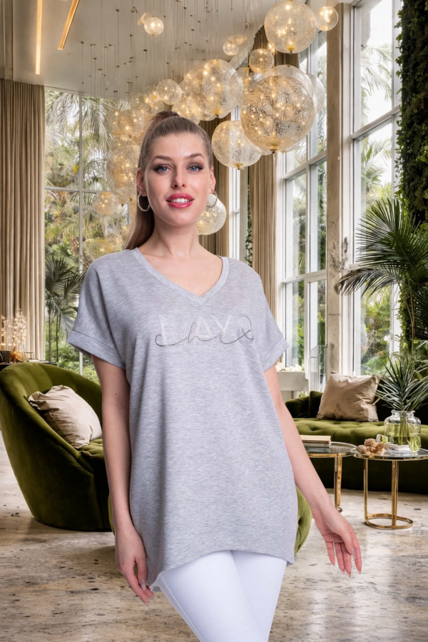 Elasztikus anyagból készült, lezser szabásvonalú tunika íves aljavonallal, strasszköves díszítéssel.