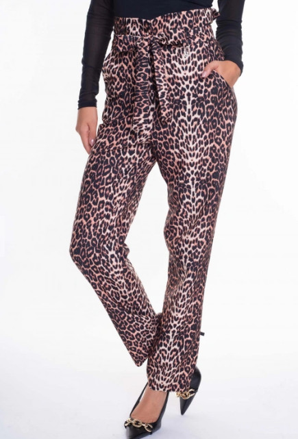 Enyhén elasztikus anyagból készült magasított derekú megkötős nadrág, kis fém márkajelzéssel.
