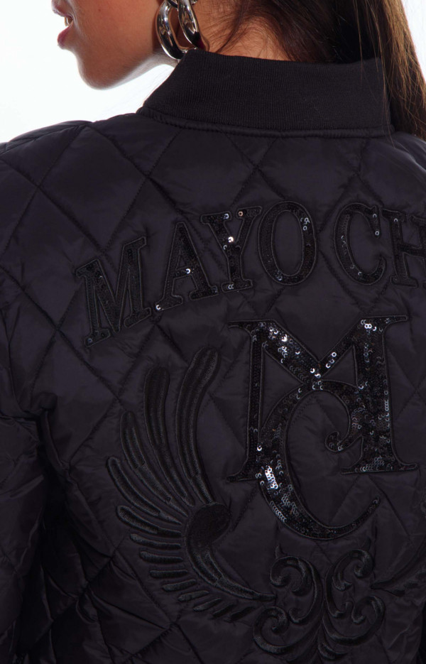 Lezser szabásvonalú, vékony steppelt kabát passzéval, elején és hátán hímzett és flitteres díszítéssel.