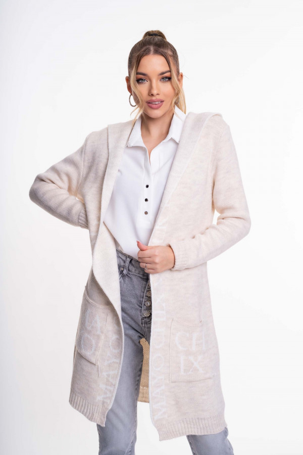 Elasztikus, kötött anyagból készült, zsebes, kapucnis, nyitott kardigán, anyagában kötött márkajelzéssel.