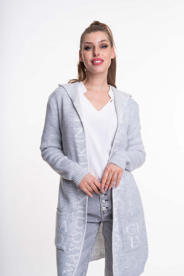 Elasztikus, kötött anyagból készült, zsebes, kapucnis, nyitott kardigán, anyagában kötött márkajelzéssel.