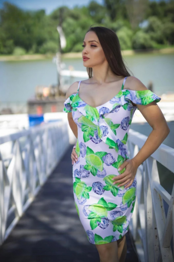 Rensix ruha csónaknyakú ejtett vállú fodros fehér alapon lime 2025