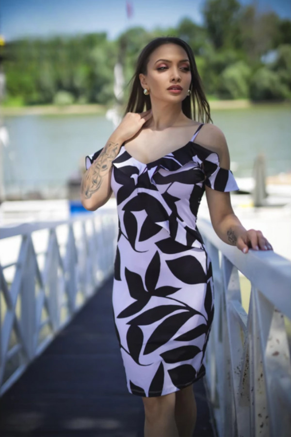 Rensix ruha csónaknyakú ejtett vállú fodros fekete/fehér virág 2025